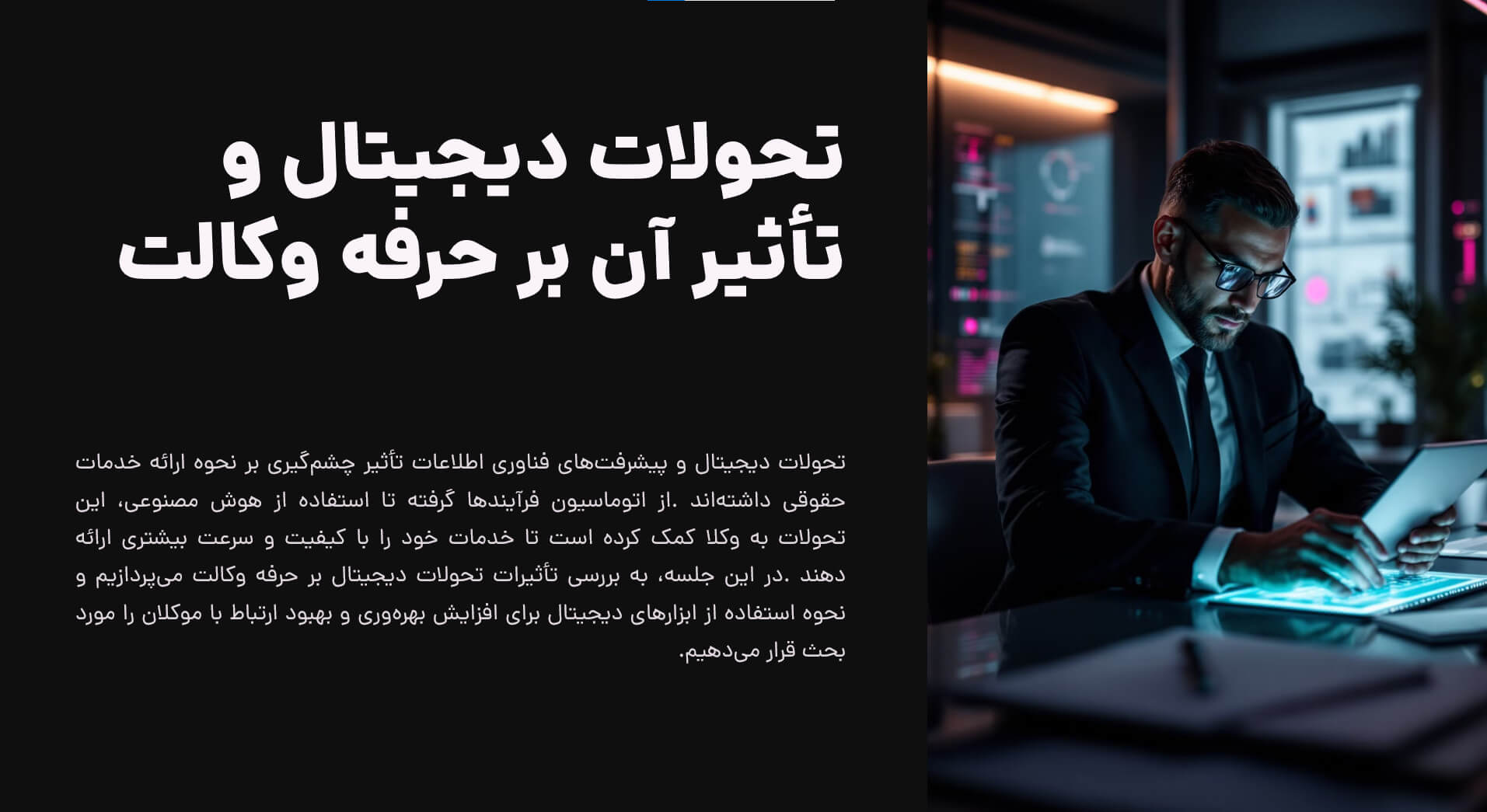 تصور کنید وکیلی که به جای استفاده از روشهای سنتی، از ابزارهای دیجیتال برای مدیریت پروندهها و ارتباط با موکلان بهره میبرد. تحولات دیجیتال و پیشرفتهای فناوری اطلاعات تأثیر چشمگیری بر نحوه ارائه خدمات حقوقی داشتهاند. از اتوماسیون فرآیندها گرفته تا استفاده از هوش مصنوعی، تحولات دیجیتال به وکلا کمک کرده است که خدمات خود را با کیفیت و سرعت بیشتری ارائه دهند. در این جلسه، به بررسی تأثیرات تحولات دیجیتال بر حرفه وکالت میپردازیم.