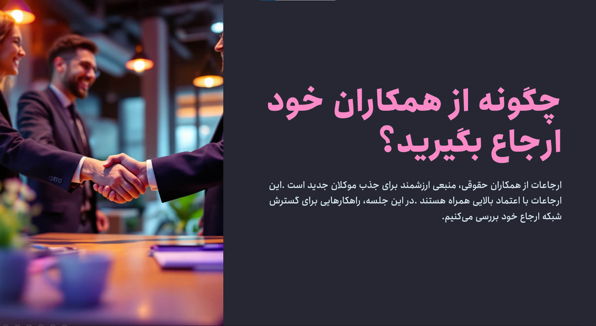 ارجاعات از سوی همکاران حقوقی میتواند یکی از بهترین منابع برای جذب موکلان جدید باشد. این نوع ارجاعات معمولاً با اعتماد بالایی همراه است، زیرا همکار شما، که خود درک خوبی از مسائل حقوقی دارد، شما را بهعنوان وکیلی شایسته معرفی کرده است. در این جلسه به بررسی راهکارهایی میپردازیم که میتوانید از طریق آنها از همکاران خود ارجاع بگیرید و شبکه ارجاع خود را گسترش دهید.