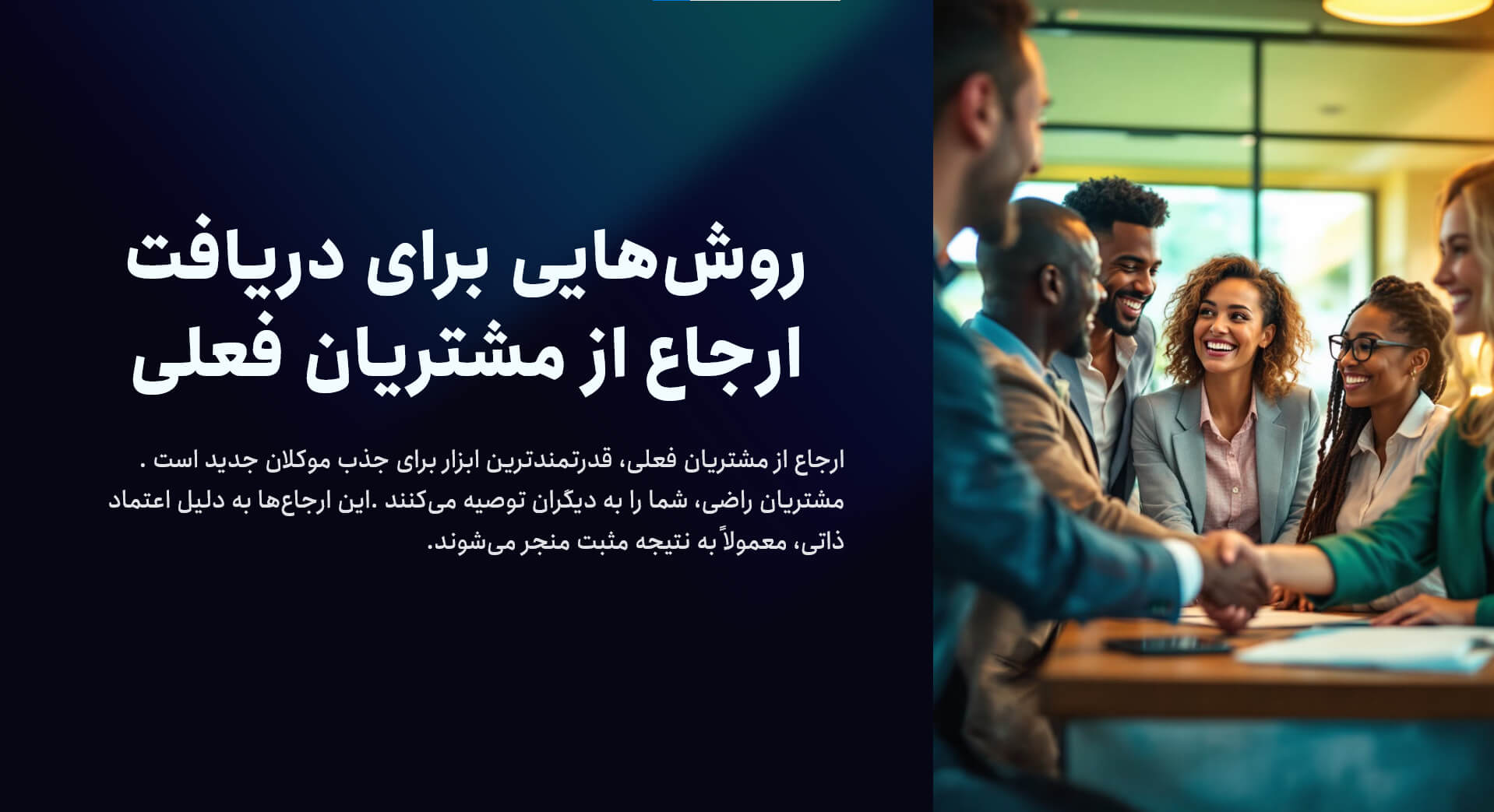 ارجاع از مشتریان فعلی یکی از قدرتمندترین ابزارها برای جذب موکلان جدید است. مشتریانی که از خدمات شما راضی بودهاند، به احتمال زیاد شما را به دوستان و آشنایان خود توصیه میکنند. این نوع ارجاعها به دلیل اعتماد ذاتی بین مشتری و معرفیشونده، معمولاً به نتیجهای مثبت منجر میشود. در این جلسه، به بررسی روشهایی میپردازیم که چگونه میتوانید مشتریان فعلی خود را به ارجاعدهندگان فعال تبدیل کنید.