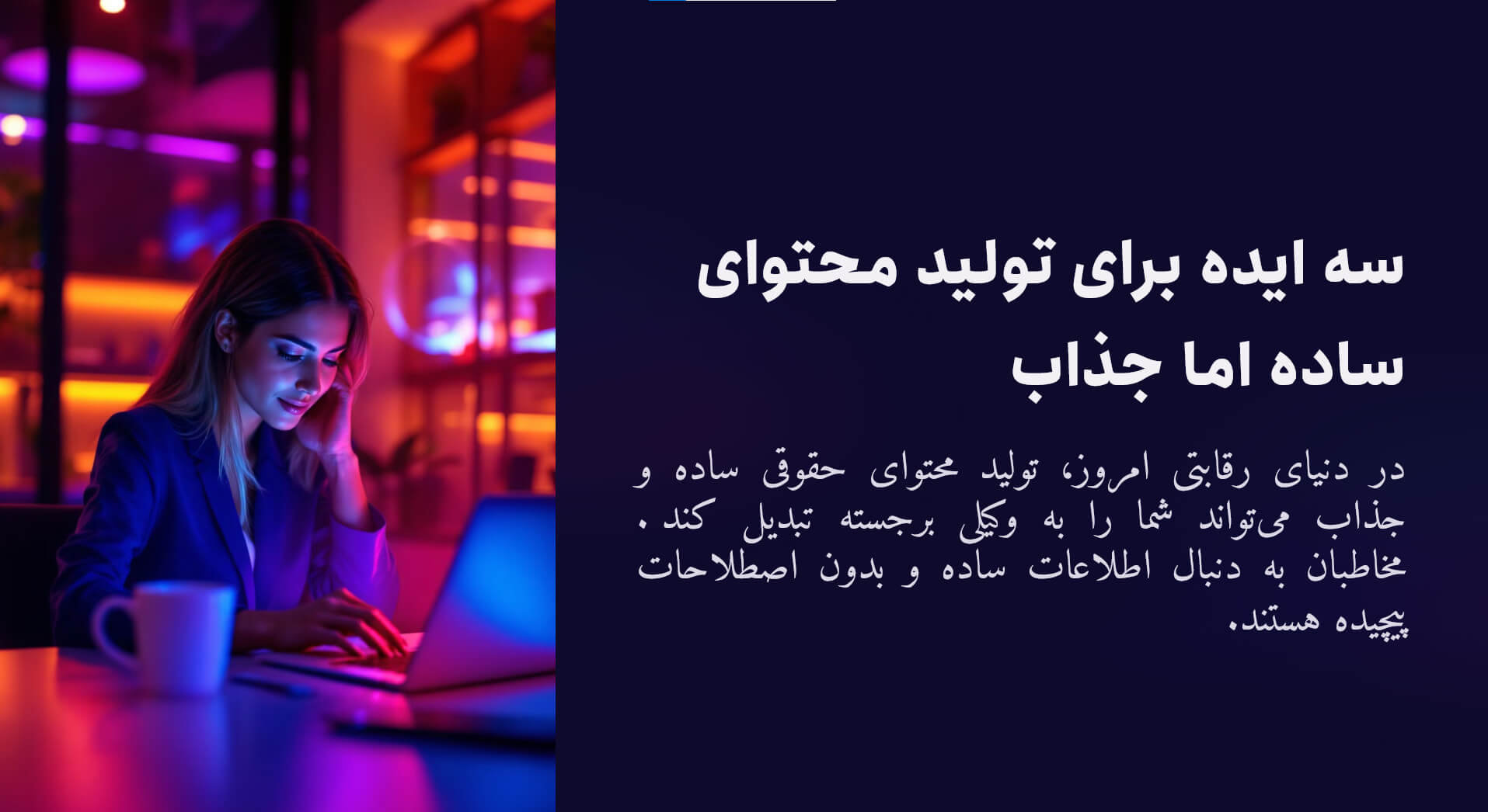 در دنیای پررقابت امروز، تولید محتوای حقوقی که هم ساده و هم جذاب باشد، میتواند به شما کمک کند تا به یک وکیل قابلاعتماد و برجسته تبدیل شوید. مخاطبان به دنبال اطلاعاتی هستند که به زبان ساده و بدون اصطلاحات پیچیده حقوقی بیان شود. در این جلسه به سه ایده ساده اما کاربردی برای تولید محتوا میپردازیم که میتواند به جذب مخاطبان بیشتر و افزایش ارجاعات شما کمک کند.