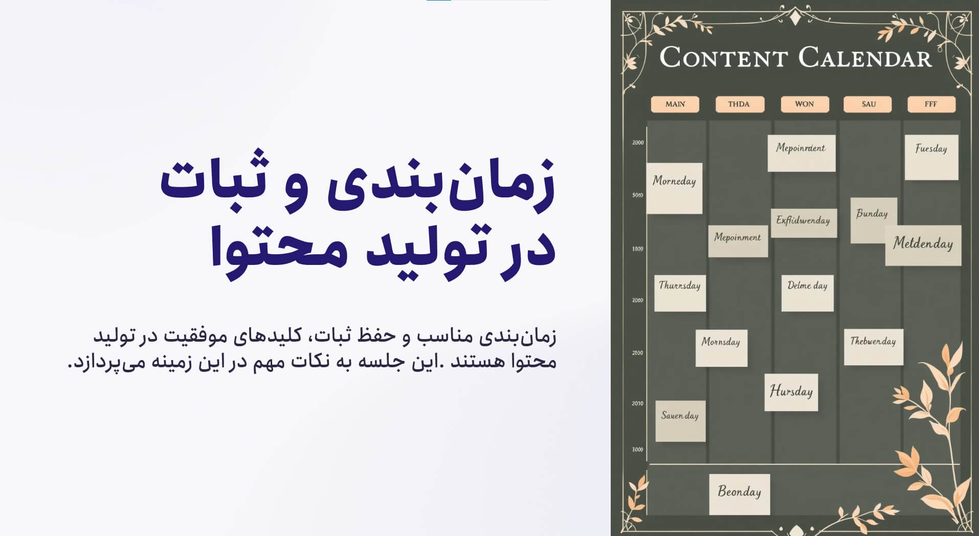 یکی از کلیدهای موفقیت در تولید محتوا، زمانبندی مناسب و حفظ ثبات در ارائهی آن است. بدون داشتن یک برنامهی منظم، حتی بهترین محتواها نیز نمیتوانند تاثیرگذاری لازم را داشته باشند. در این جلسه به نکات مهم در زمانبندی و اهمیت ثبات در تولید محتوا میپردازیم.
