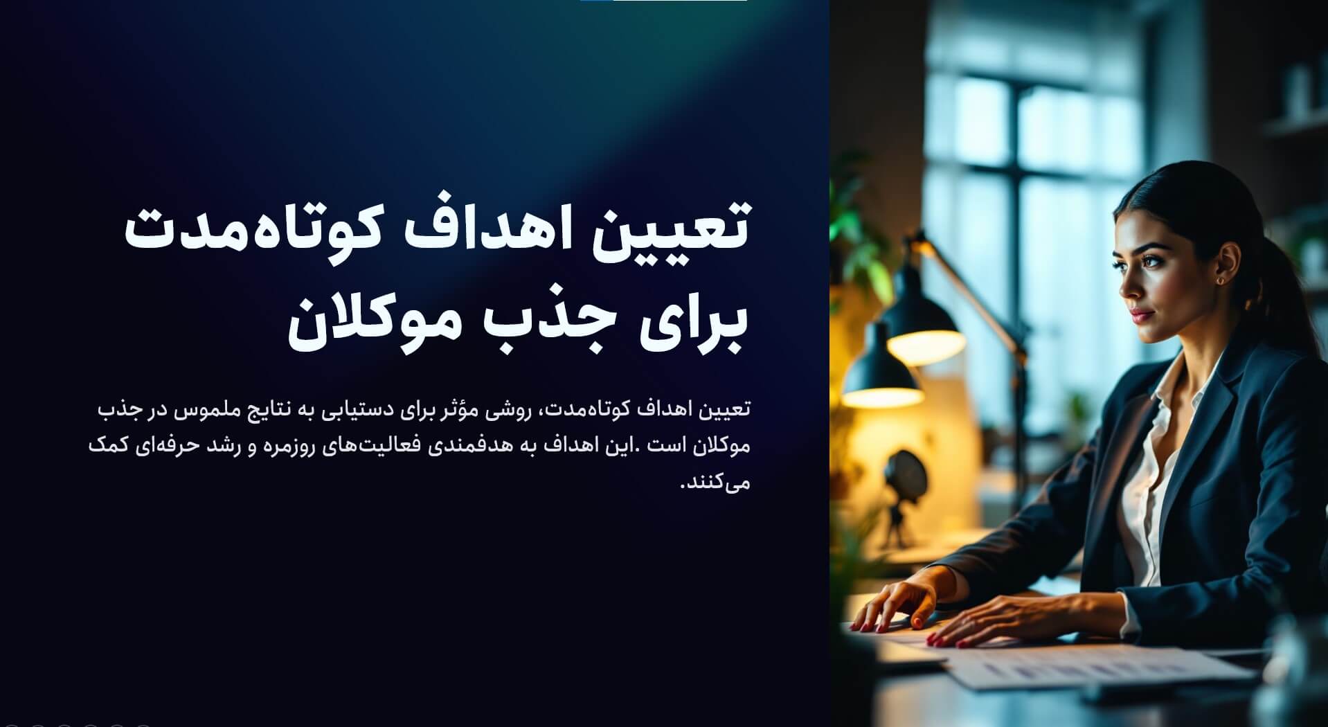 تعیین اهداف کوتاهمدت یکی از مؤثرترین روشها برای دستیابی به نتایج ملموس و پایدار در جذب موکلان است. این اهداف به شما کمک میکنند تا فعالیتهای روزمره خود را به صورت هدفمند انجام دهید و مسیر رشد حرفهای خود را به وضوح مشخص کنید. اهداف کوتاهمدت نه تنها به ایجاد انگیزه کمک میکنند، بلکه امکان ارزیابی عملکرد و اصلاح روشها را نیز فراهم میسازند. در این جلسه، به اهمیت تعیین اهداف کوتاهمدت و چگونگی استفاده از آنها برای جذب موکلان بیشتر میپردازیم.